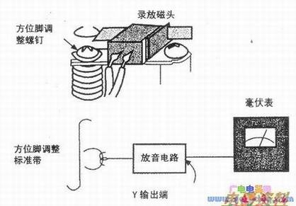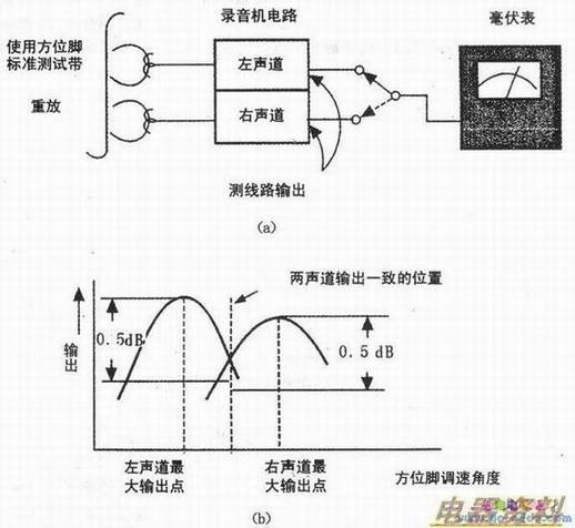 对录音机磁头方位角的调整要考虑两个声道的平衡问题,测试方法如下图所示。在使用标准信号测试带进行方位角的调整时要分别测量双声道的输出,两个声道的输出尽可能一致。同时还要考虑不低于最大输出的0.5dB,然后确定最佳的方位角。