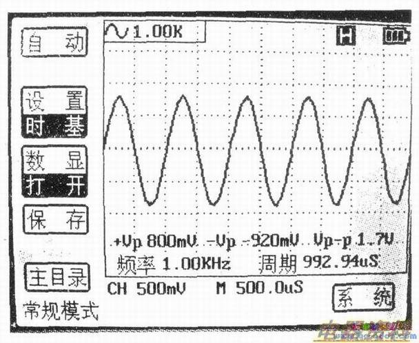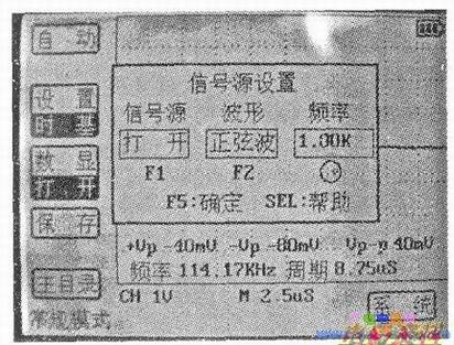 打开ET521A示波表开关,将控能开关放在OSC档,然后按下开关2s左右,松开按健,屏幕弹出一个窗口,如上图所示。按“Fl”键打开信号源,按“F2”键选择正弦波,再旋转编码开关选择1k,选择好后,按“F5”键确认。弹出的窗口退出,在波形显示区的左上角,有一符号显示出正弦波1kHz,如下图所示。