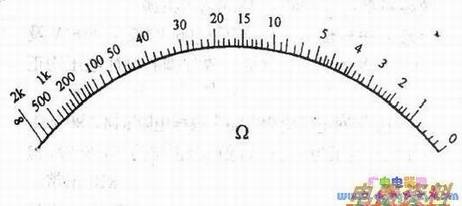 由于流过表头的电流与被测电阻不是线性关系,所以电阻档标度尺的刻度是非均匀的,当被测电阻Rx较大时,电路中的工作电流小,指针偏转角也小:当被测电阻Rx为零时,电路中的工作电流是满偏电流,指针满刻度偏转;当被测电阻Rx为无穷大时,电路中的工作电流近似为零,指针的偏转角度也近似为零(这时指针指在交流电压标度尺的零位上)。所以电阻档的标度尺是反向刻度的,如下图所示。