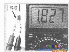 1)当红表笔接二极管阳极,黑表笔接二极管阴极,二极管正偏导通,数字表此时显示是该二极管正向导通电压降,一般硅管为0.5一0.6V之间,见上图;红色或绿色普通正向导通电压降一般为1.8V~2V之间,见下图,现在各种流行的用于照明和信号指示的高亮度发光二极管导通电压降更高。