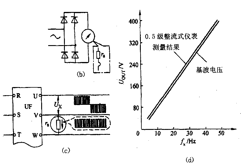 所谓整流式仪表,就是把交变经整流后再通入磁电式仪表,是用磁电式仪表来测量交流电的一种方式,如下图(b)所示。由于线圈的匝数不多,故量小。当用来测量交流电压时,因为串联了阻值很大的附加rA,.故整个测量基本上呈纯性质。所以,利用它来测量的输出电压时,流入线圈的波形基本上和电压波形相同,如下图(c)所示。利用这一特点,由整流式仪表来测量变频器的输出电压是比较准确的,其测量结果如下图(d)所示。由于变频器的输出电压中含有高次谐波成分,故测量结果与基波电压相比,略大一些。