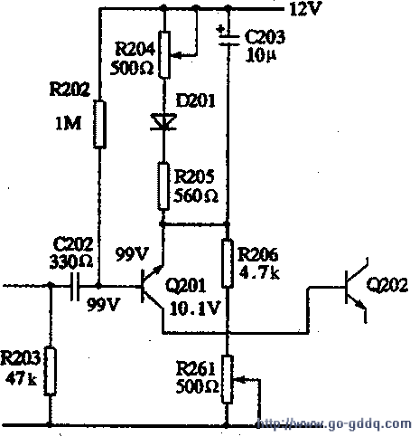 一台海燕牌CS47-2-AV(属JVC7695机芯)彩电,出现亮度失控,在检查相关的箝位电路(如下图所示)时,用MF47型万用表测得箝位管Q201的发射极电压正常,但测得基极电压仅为4.5V,与图纸上标的9.9V差别很大,索性认为该管损坏,但脱机测量三极管Q201却正常,装上后再用示波器交流耦合输入(AC输入)测量基极波形,能观测到经延时了的行同步脉冲(即箝位脉冲),再换为直流耦合输入(DC输入)测量,发现平均电位约10V,说明这部分电路是正常的。经分析发现,Q201除筘位脉冲期间其余时间都是截止的,电路上为了保证脉冲到来时能饱和导通,设置了一个阻值达1MΩ的上偏置R202。一般测量都是测对地电压,由于测量时万用表内阻相当于一个下偏置,其值与R202电阻同数量级,R202与万用表的内阻的分压使得万用表的测量结果失去了意义。