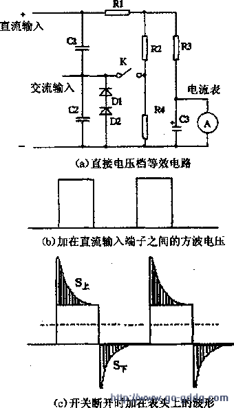 测量脉冲电压平均值有误差的万用表,在直流电压档使用时,为交流电压档整流设计的Dl、D2始终是接入电路的(即开关K是闭合的),而无误差的万用表(如MF47型等)中在直流电压测量时这条支路是断开的(即开关K断开)。这两种接法,虽然对直流测量没有什么不同,但对脉冲平均电压的测量却有不同的效果。由于脉冲电压有丰富的谐波,而电路中不可避免地有分布的存在,这些分布与电阻网络构成的阻容网络对脉冲电压的响应,使加在表头上的信号变成如下图(b)所示的波形,如果D1、D2支路是断开的话,阻容网络在表头两端电压波形上、下阴影部分的面积是相等的,其直流平均值由于上、下阴影面积一正一负而抵消,实际测量的平均值不受分布电容的影响。若D1、D2支路始终是接入的话,由于二极管对负向脉冲的限幅作用,使负向脉冲的面积小于正向脉冲的面积,如下图(c)所示,结果平均值偏大,而且,脉冲的高度愈高,偏差愈大。