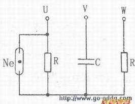 (2)氖灯相序检测器 利用试电笔中的氖管作指示器与、等元件组成检测器,电路如下图所示。接入三相电源后,氖灯不亮为正序,说明电源相序与图中标注相序相同,氖灯亮为逆序。