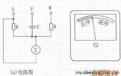 (1)相序表 相序表是由表、、等构成,其如下图(a)所示。接入三相后,电压表读数小于某一值时为正序(即被测相序与仪表标注相序相同)。大于某一值时为逆序,如下图(b)所示。
