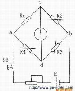 在四边形的一个对角线ab上,经过按钮SB接入直流E。另一个对角线cd上,接入平衡指示器(即检流计)。