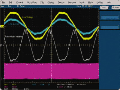 透过TDSPWR2 的这种调制分析功能和TDS5000/7000 系列示波器的每秒5GS高取样速率,以及深度记录长度,设计人员便能够以高水平解析度,轻松地撷取线信号的两至三个周期和快速瞬态开关信号。TDSPWR2可自动计算脉冲宽度变量与时间的关系曲线。(图5所示为线路电压、电流信号以及脉冲宽度时域波形。)您可检视PWM信号脉冲宽度变量随时间变化的曲线,以及线路电压和线路电流。这就提供了PWM信号行为的一幅全景图,而在负载和线路电压变化之际,这正是保持所需的PF所必不可少的资讯。该应用软件可即时撷取PWM信号中的任何不合乎要求的瞬态。