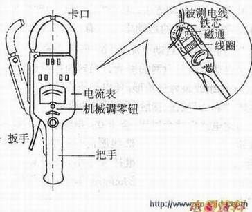 钳形电流表的主要部件是一个穿心式电流器,在测量时将钳形电流表的磁铁套在被测导线上,形成1匝的初级线圈,利用电磁感应原理,次级线圈中便会产生感应电流,与次级线圈相连的电流表指针便会发生偏转,指示出线路中电流的数值。