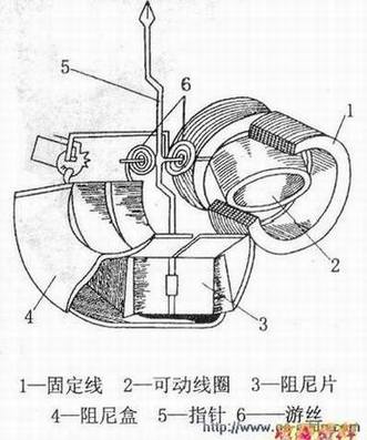 电动系测量机构是利用两个通电线圈之间的电动力来产生转动力矩的,它有固定线圈“1”和可动线圈“2”两个线圈。固定线圈“1”分为平行排列、互相对称的两部分,中间留有空隙,以便穿过转轴。改变固定线圈两部分之间的串、并联关系可以得到不同的量程。可动线圈与转轴固接在一起,转轴上装有指针“5”和空气阻尼器的阻尼片“3”。游丝“6”用来产生反作用力矩,并起引导电流的作用。其结构如图所示.