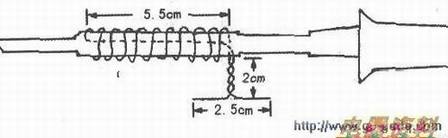 用φ1.5mm的铁丝在烙铁头上平绕34匝,如图下所示,虚线表示第一个线头,被压在整个线圈下面,待线圈绕好后,与第二个线头绞紧,留下2cm长的绞线,然后把两个线头水平分开呈两只共长2.5cm的“脚”,用于支撑烙铁。经这样处理后,整把烙铁的温度有所降低。