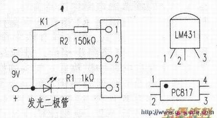 1、把LM431按下图中(1)、(2)、(3)脚对应地插人工具的(1)、(2)、(3)脚中,不发光;按开关K1后发光发光,即为TC431完好。