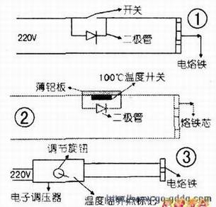 图2的电路只是用温度开关代替普通开关,把温度开关固定在一薄铝板上,只要电烙铁的烙铁头放在薄铝板上,一旦温度达到100℃温度开关就会断开。这时只有二极管通电,电烙铁以半波状态工作,使电烙铁的功率降低以防止电烙铁的烙铁头过热,也间接延长电烙铁的使用寿命,同时工作时不用按开关了。