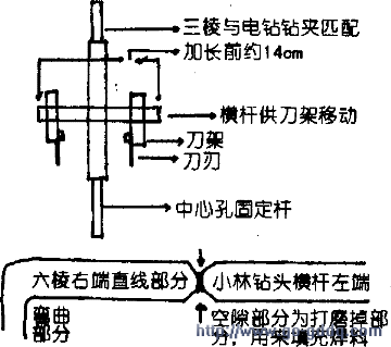 到电焊机械修理处进行。先把l根待焊六棱与钻头横杆左端进行适当打磨以吃下焊料,对齐棱面后即可焊接,焊右杆也如法进行。