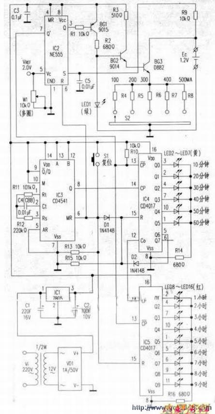 2.时基信号发生器由可编程定时器IC3连接成循环工作状态,校正①脚上定时R11使⑧脚输出方波脉冲,其为10分钟,作为下面计数器电路的基准信号。。3.计数器电路由10进制计数器IC4接成6进制电路为分钟,由LED2-LED7指示,其中14脚为信号输入端,13脚低电平计数而高电平则锁定。另10进制计数器IC5接成10进制为小时显示,由LED8一LED16指示,其中③脚Q端空位由前级分钟取代。电路中,必须注意15脚复位端,因IC5为两重复位,故加入了隔离D1与D2,使其独立复位,以保证互不干扰。