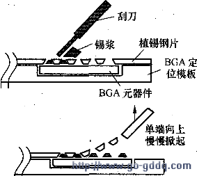 将植锡板固定到IC上面,把锡浆刮印到IC上面之后,将热风枪风量调大、温度调至350℃左右,摇晃风嘴 对着植锡板缓缓均匀加热,使锡浆慢慢熔化。当看见植锡板的个别小孔中已有锡球生成时,说明温度已经到位,这时应当抬高热风枪的风嘴,避免温度继续上升。过高的温度会使锡浆剧烈沸腾,造成植锡失败,严重的还会使IC过热损坏。锡球冷却后,再将植锡板与IC分离。这种方法的优点是一次植锡后,若有缺脚、锡球过大或过小现象,可进行二次处理,特别适合新手使用。