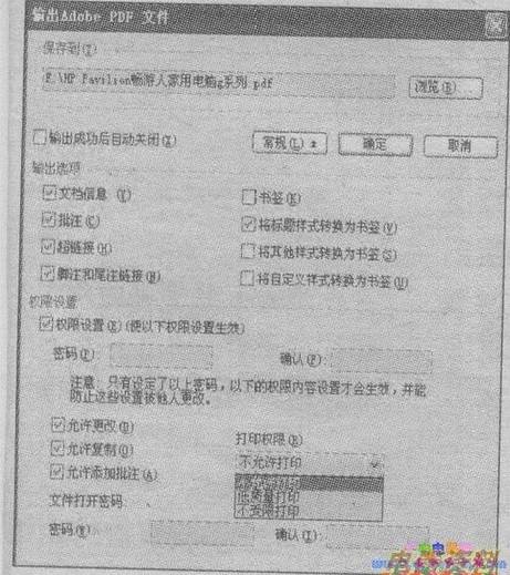 其中“输出选项”可以按默认值设置不做改动,关键是下面的“权限设置”,首先勾选“权限设置(使以下权限设置生效)”的复选框,然后设定权限设置的密码(此步必须要操作,否则其他人也能轻易地修改权限了),完成后可以根据具体的共享要求设置了。如指定对象才能查看的,可以在“文件打开密码”中设置密码(注意文件打开密码和权限设置密码不能相同,否则权限设置就形同虚设了);如果只能查看不能修改的就清空其中的“允许更改”复选框;对于只能看但不允许复制文档内容的就清空“允许复制”复选框。