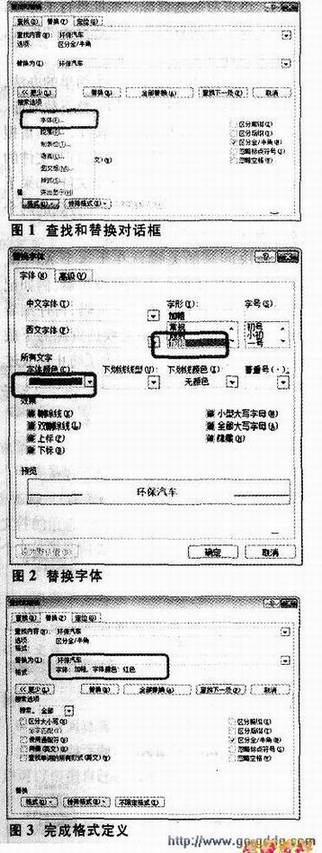 Step1:打开替换对话框,可以看到在替换选项中有一个“更多”的按钮。单击这个按钮,我们就可以看到“格式”按钮,如上图所示,把光标定位在“替换为”后面的文本框中,再单击“格式”I“字体”,即可以打开“替换字体”对话框。如中图所示。