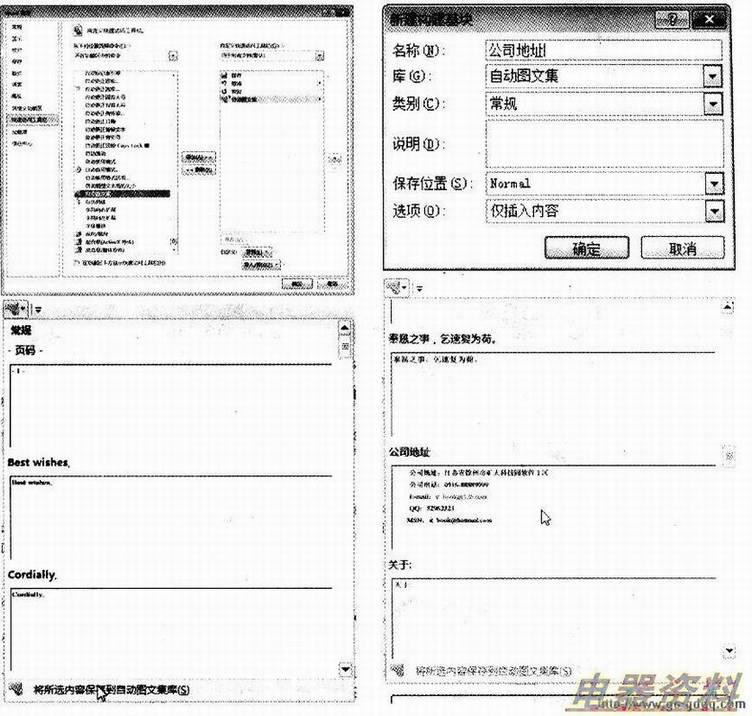 Step3:打开“新建构建基块”对话框,设置好名称后,单击“确定”按钮。这样就定义好了一个名称“公司地址”自动图文集,如上右图所示。