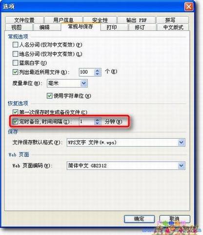 写论文是一个漫长的过程,如果出现突发情况,比如断电,系统故障等等,写下来的得不到保存那是很窝火的事。点击“工具→选项”菜单,点选“常规与保存”标签,勾选“定时备份”,并将时间调为最小,如1分钟。(图3)