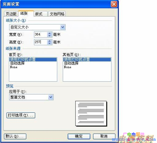 ①点击“纸张”标签,在纸张大小选择区选择“自定义大小”,在宽度后面的输入区输入“364毫米”,在高度后面的输入区输入“257毫米 ”,如图1。