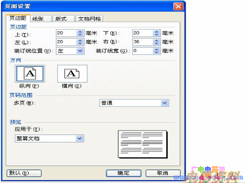 ③点击“页边距”标签,将“上,下,左边距”均设置成“20毫米”,右边距设置成“36毫米”;如图3。
