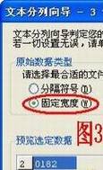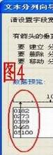 选定需分列的数据,选菜单数据——分列——固定宽度——在数据预览区的第2第3位数之间点击,即出现一个分列箭头(箭头能用拖动)——点下一步,点击右上角的目标区域,选中B2单元格,回头再点一次目标区域——点完成。(如图2-图6)