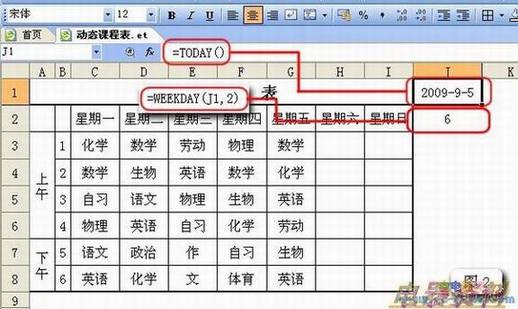 3、获取当前日期是星期几:在J2单元格中输入公式“=WEEKDAY(B9,2)”(如图2)。