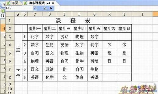 1、制作普通课程表:打开ET,输入课程表(如图1)。