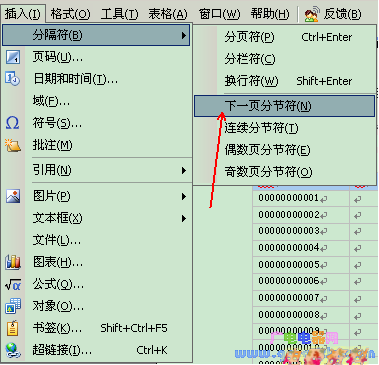 就在这里,呵呵,一共有4种类型,根据字面意思很容易理解它所产生的效果。我这里选的是“下一页分节符”,它可以在插入点位置将当前页和后面的页分割为两个节。插入之后,看到的效果如图: