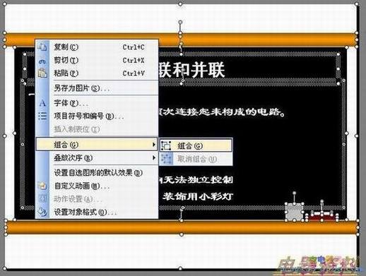 5、拖动鼠标选中幻灯片上的所有内容后,单击鼠标右键,在弹出菜单中单击“组合→组合”命令(如图3)组合图形。