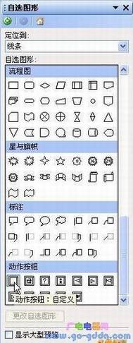 6、依次单击“绘图工具栏”中的“自选图形→更多自选图形”命令,在右侧窗格中找到“动作按钮”类别后,单击“动作按钮:自定义”(如图4),拖动鼠标,在幻灯片上绘制一个空白动作按钮,此时系统会弹出“动作设置”对话框,直接单击对话框下方的“取消”按钮将其关闭,在按钮上右击鼠标,在弹出菜单中单击“添加文字”命令,添加文字“显示板书”后,合理设置文字的字体、字号、颜色。