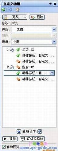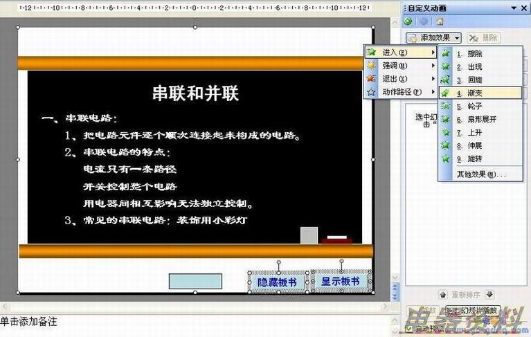 1、选中组合后的图形以及两个控制按钮后单击鼠标右键,在弹出的快捷菜单中单击“自定义动画命令”,在幻灯片右侧的“自定义动画”任务窗格中依次单击“添加效果→进入→渐变”(如图5),为3个对象添加进入动画后,再依次单击“添加效果→退出→渐变”,为他们添加退出动画。