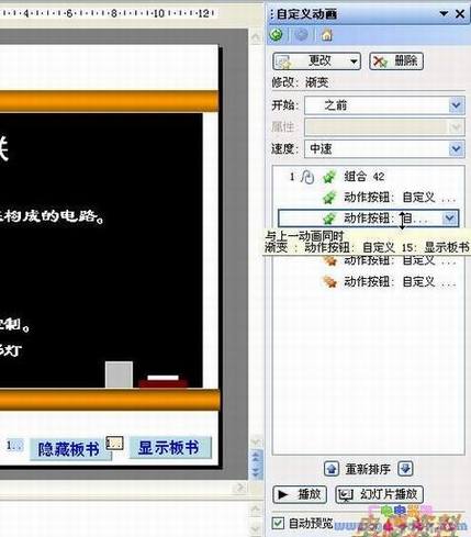 2、在动画序列窗口中,选中与“显示板书”按钮出现动画对应的选项(如图6),
