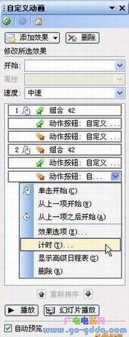 按下“Ctrl+A”组合键选中全部动画选项后,单击右侧的下拉箭头,在弹出的下拉菜单中单击“计时”命令(如图8),