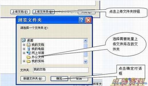 4.点击在"文档上传管理"对话框的下端"上传文件夹"按钮,打开"浏览文件夹"对话框,选择要批量上传的文件所在的文件夹(可以事先新建一个文件夹,将需要上传的文件都复制到里面),点击“确定”按钮,回到“上传文件管理”对话框。