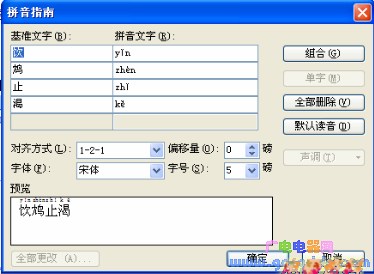 选中我们需要添加拼音的字或者词,比如“饮鸩止渴”,然后点“格式”——“中文版式”——“拼音指南”,弹出如下窗口: