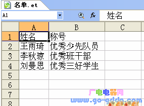 首先,我们要制作一份名单,这个名单可以用WPS来做,也可以用ET来做,这里就以ET为例。新建一个表格,这里我们只有两列数据,分别是姓名和称号,这个根据你的需要进行设计。然后在输入相应的数据,如下图。
