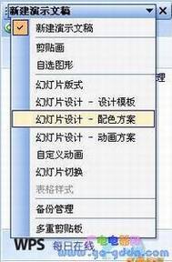 1、拖动选中添加了超链接的文字后,单击屏幕右侧“新建演示文稿”窗格右侧的下拉箭头,在弹出菜单中单击“幻灯片设计—配色方案”命令(如图2)后,