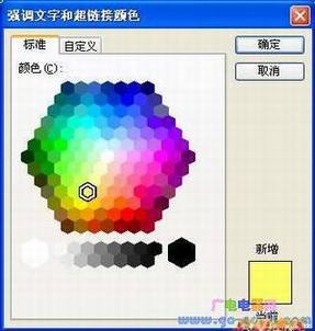 单击对话框底部的“更改颜色”按钮,在弹出的“强调文字和超链接颜色”对话框中单击所需的色块(如图5)后,再单击“确定”按钮关闭对话框。