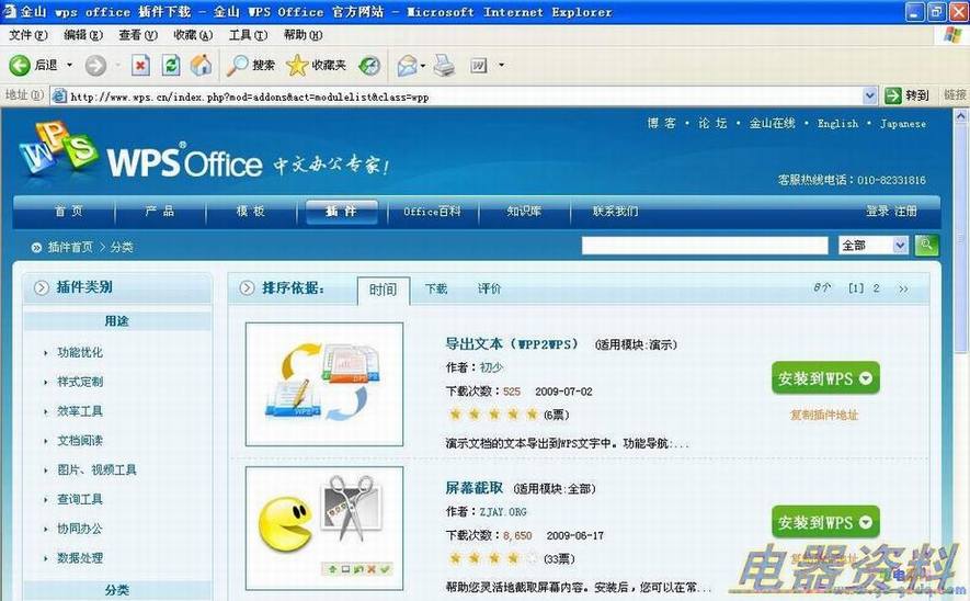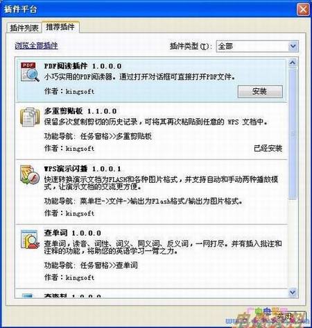 2、单击对话框顶部的“推荐插件”标签,在推荐插件列表中并未找到所需的插件,不要紧,单击对话框上部的“浏览全部插件”(如图3),即可进入WPS官网的插件版块,在这里可以看到官方公布的最新插件。