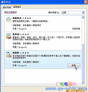 打开WPS文字,单击“插件”工具栏上的“插件平台”图标,打开“插件平台”窗口。单击切换到“推荐插件”选项卡,在显示的推荐插件列表中,已安装的插件项会注明已经安装,可以看到“查资料”插件并未安装。选中“查资料”插件项,单击显示的“安装”按钮(图3),等插件下载安装完成即可。