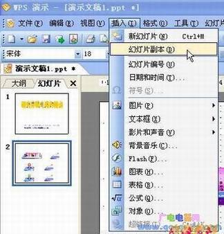 4、单击“插入”菜单里的“幻灯片副本”命令(如图5),复制第2张幻灯片后,将电池组右侧断开开关的图片删除后,插入闭合开关的图片,并仔细调整其位置,使其与原图片位置重合。
