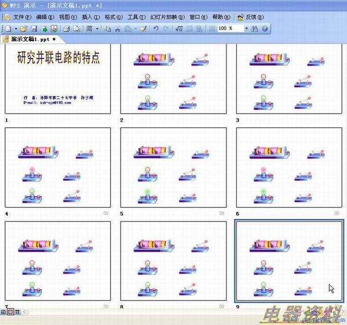 7、按下shift键连续单击鼠标选中所有导线后,复制并粘贴到其余7张幻灯片里。