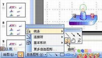 6、单击第2张幻灯片的缩略图,切换回普通视图后,依次单击绘图工具栏里的“自选图形/线条/曲线”命令(如图7),