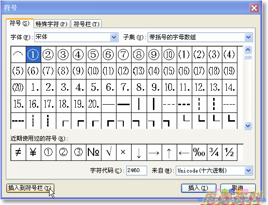 1、如下图,在符号的面板中,寻找你所要的符号,比如“①”,选中它,点击“插入到符号栏”,这样符号栏的字符容量就丰富了: