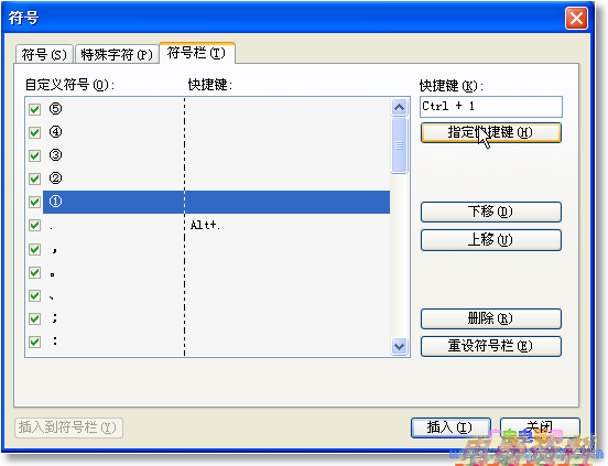 2、切换页框到“符号栏”,在“自定义符号”中找到刚刚插入的符号“①”,点击选中,之后在“快捷键”文本框中输入你要插入此符号的快捷键,注意避免和系统快捷键冲突。比如输入“l+1”(就是按住Ctrl键不放,按“1”键)。