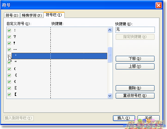 3、整理符号栏。符号栏中的内容太多了,反倒起不到快速寻找的作用,应将不用的符号删掉!方法很简单,就是选中要删除的符号,点击右侧的“删除”按钮。当然还可以为符号调整顺序,如图: