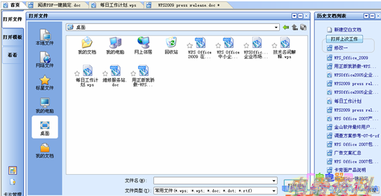 打开WPS文字2009,首先会显示的是一个“首页”频道,比传统的办公软件欢迎窗口多了很多元素,特别是右侧的历史文档列表最有实用意义,很多时候我们要手忙脚乱去文件夹里翻上好几层才能找到刚才编辑的文档,现在一目了然都列了出来。