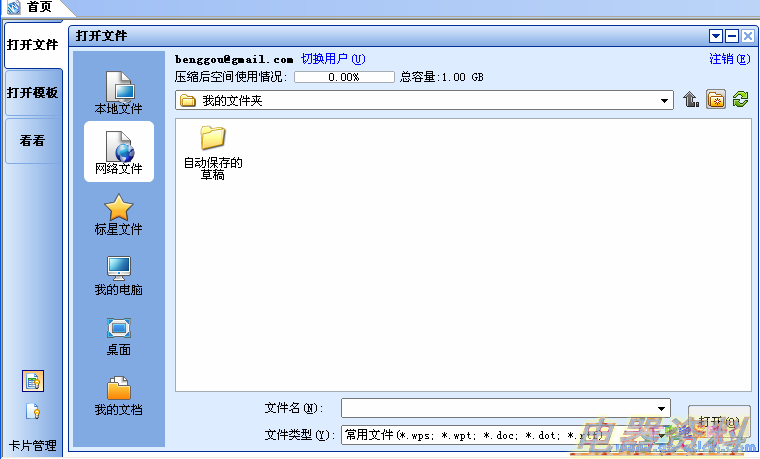 WPS网络存储空间在“打开文件”——“网络文件”这里(如图2),第一次使用时需要填写WPS通行证(如图3)。