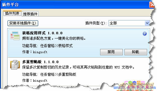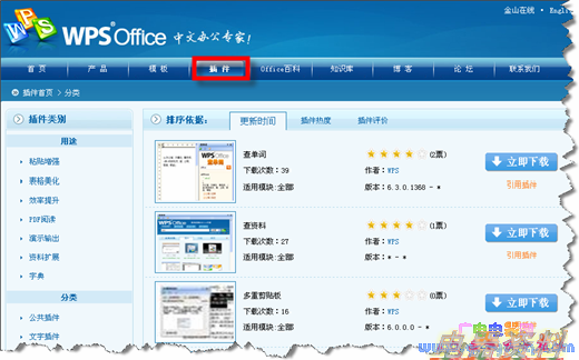 ”按钮,打开“插件平台”对话框,单击“推荐插件”选项卡中的“浏览全部插件”按钮,或者直接打开官网(http://www.wps.cn),单击“插件”菜单,就可以看到官方最新的插件。